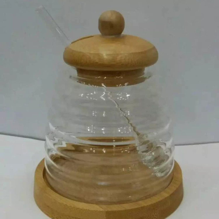عسل خوری شیشه ای با درب و پایه چوب بامبو