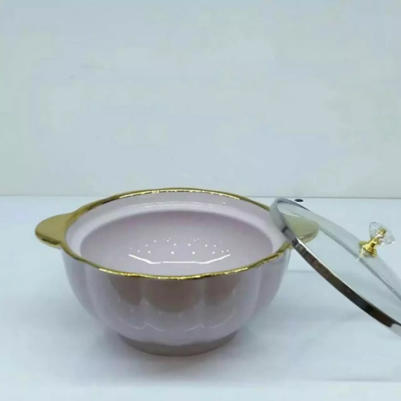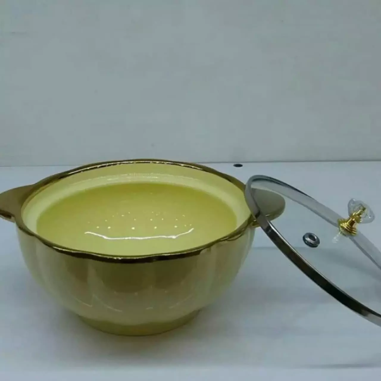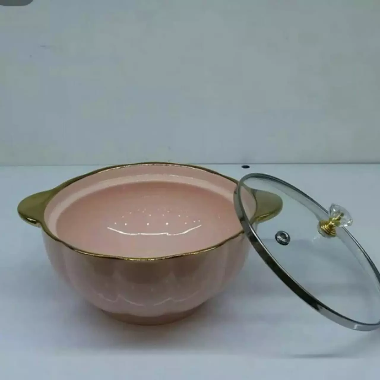 این محصول بسیار خاص و شیک مختص شیک پسندان میباشد قابلمه سرامیکی دور طلایی بهمراه درب پیرکس با دستگیره فوق العاده خاص و زیبا